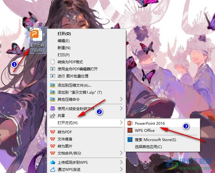 1、第一步,我们对桌面中的演示文稿右键单击,然后先点击“打开方式”选项,再选择“PPT”选项