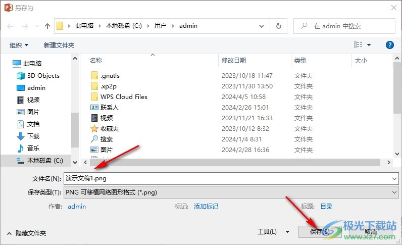 5、第五步,点击“另存为”选项之后,我们进入文件夹页面,然后在该页面中选择好保存位置,最后输入文件名称并点击保存选项即可
