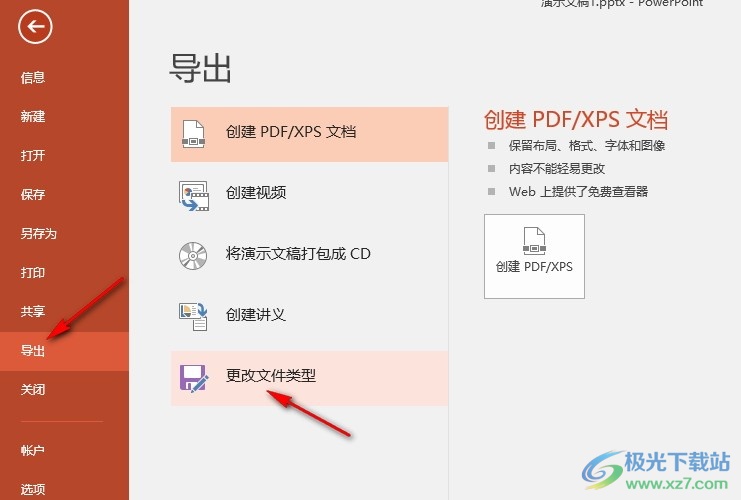 3、第三步,接着我们在文件页面中先点击打开“导出”选项,然后在导出页面中再点击打开“更改文件类型”选项