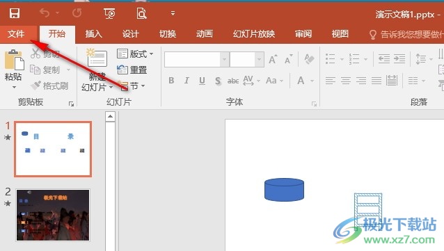 2、第二步,打开演示文稿之后,我们在PPT页面左上角找到并打开“文件”选项,进入PPT文件页面