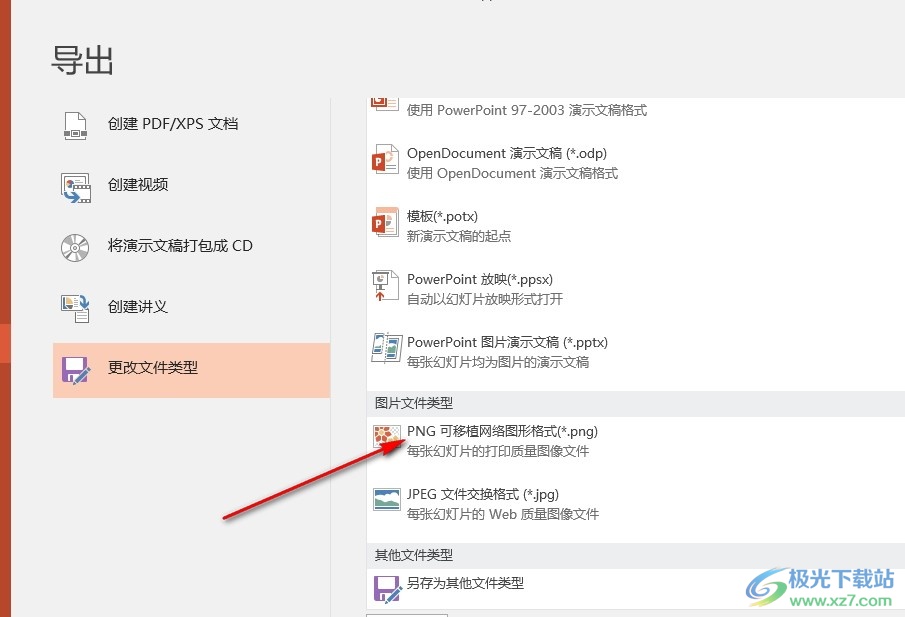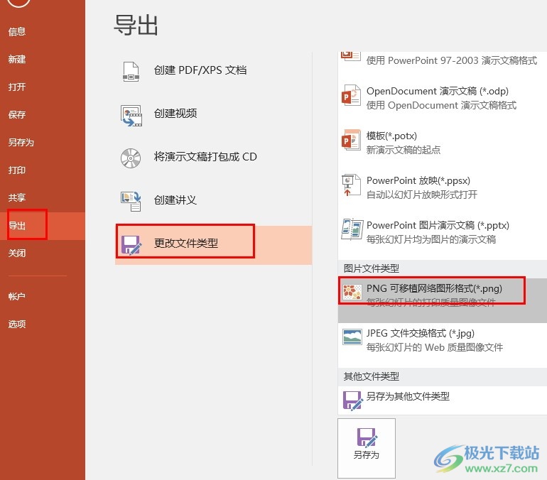 4、第四步,打开“更改文件类型”选项之后,我们在右侧页面中找到“PNG”选项,点击该选项,再点击“另存为”选项