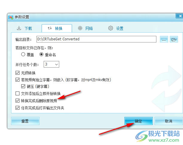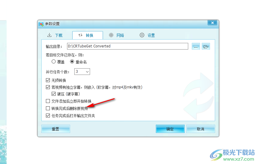 以上就是小编整理总结出的关于CR TubeGet转换完成后删除原视频的方法,我们在CR TubeGet中点击“三”图标,再选择设置选项,进入设置页面之后点击“转换”选项,最后在转换页面中将“转换完成后删除原视频”选项进行勾选即可,感兴趣的小伙伴快去试试吧。