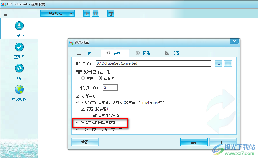 很多小伙伴都喜欢使用CR TubeGet软件,因为这是一款下载神器,它可以下载多个视频网站中的视频,包括但不限于腾讯、B站、爱奇艺以及抖音等,还可以下载网易云音乐中的歌曲,使用起来十分的方便。在使用CR TubeGet软件对视频进行格式转换时,我们经常会发现转换之前的视频海保存在电脑中,这无疑会加重内存的负担,我们可以选择将CR TubeGet中的“转换完成后删除原视频”功能打开,减少视频占用的内存。有的小伙伴可能不清楚具体的操作方法,接下来小编就来和大家分享一下CR TubeGet转换完成后删除原视频的方法。