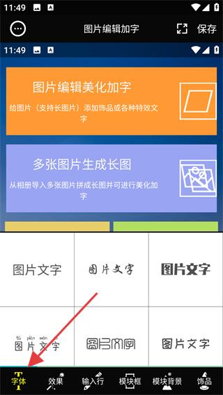 3、进入编辑页后,点击底部【字体】选项,展开字体选择列表。