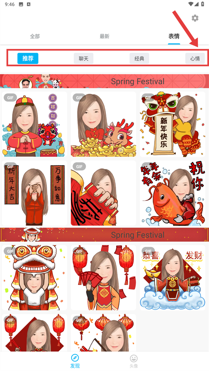 3、在表情页面,可选择【心情】等分类标签,快速筛选出心仪的表情包类型,精准找到你想要的风格哦。