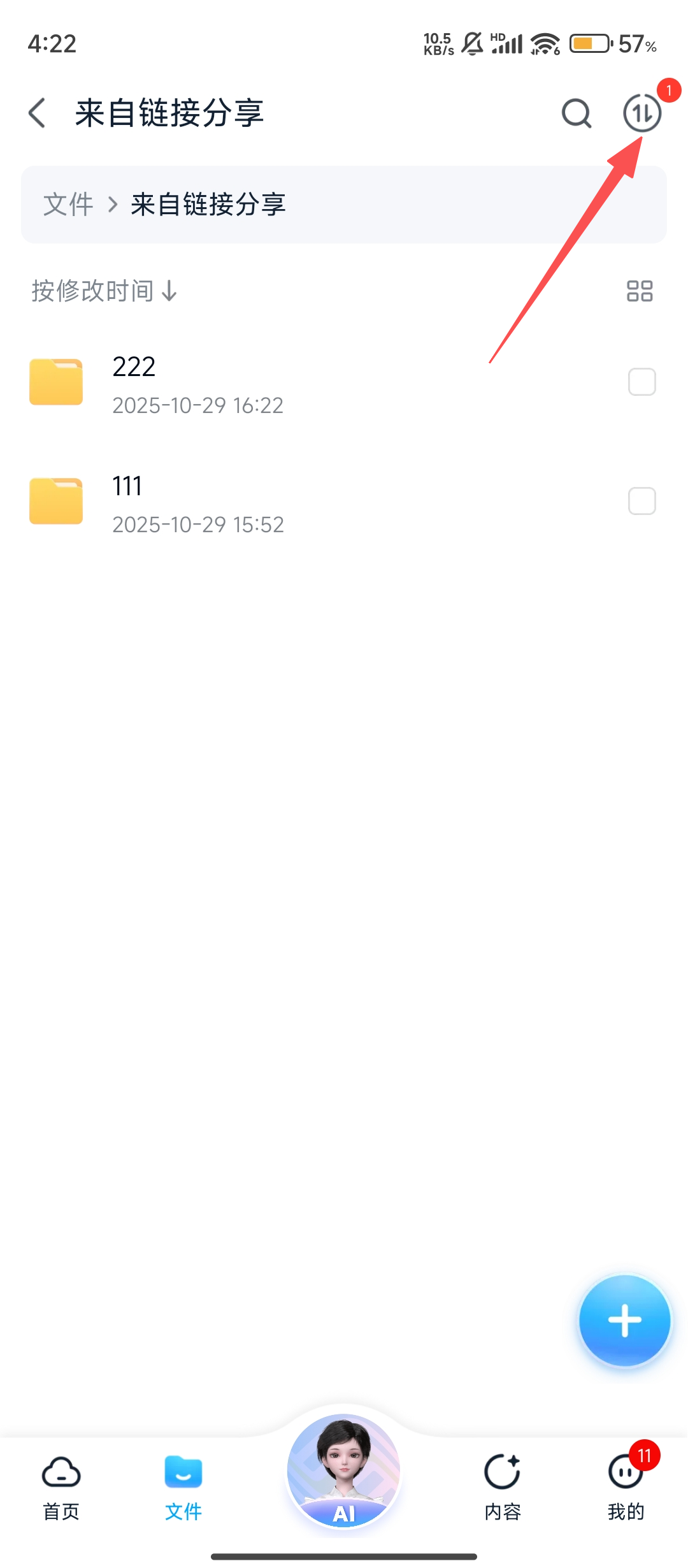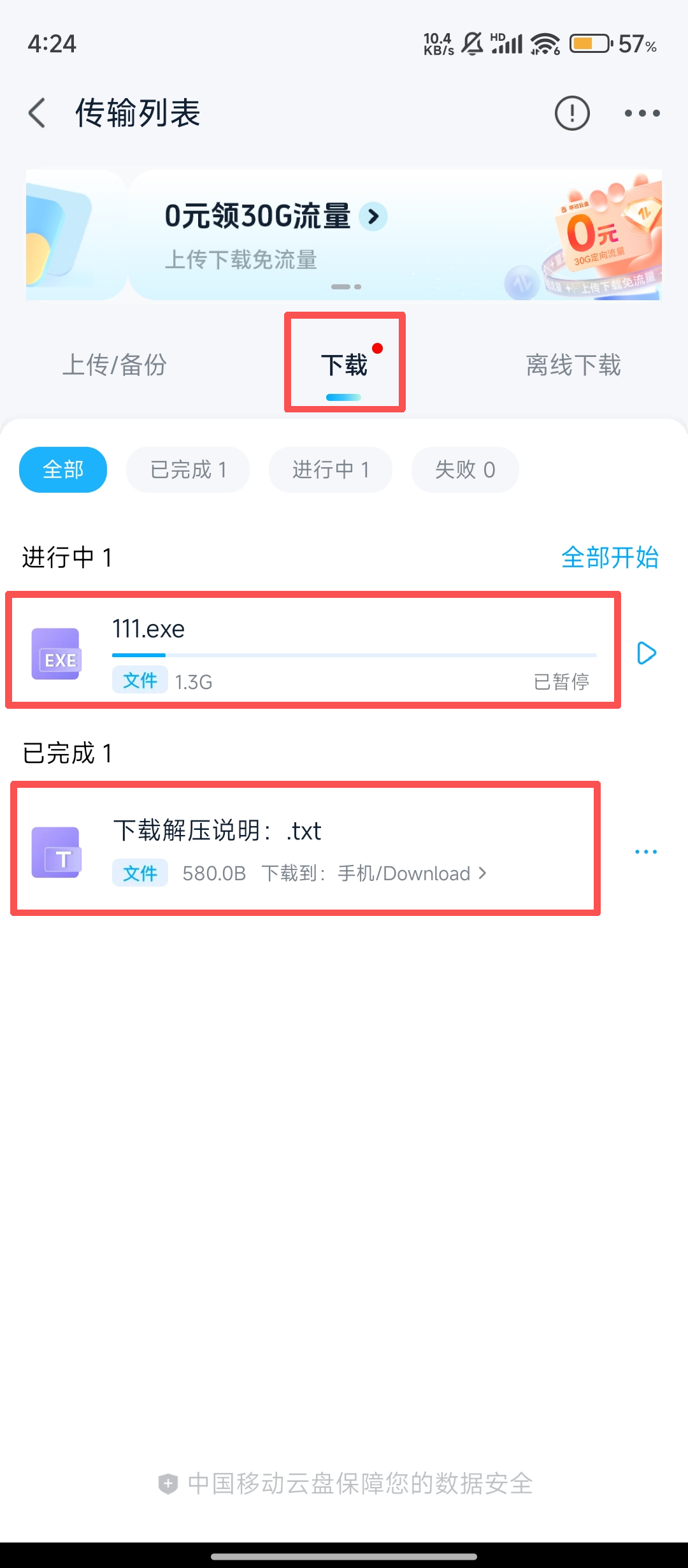 1、打开中国移动云盘,在文件页面点击右上角【传输列表图标】,进入下载管理页面,开启删除文件的流程哦。
