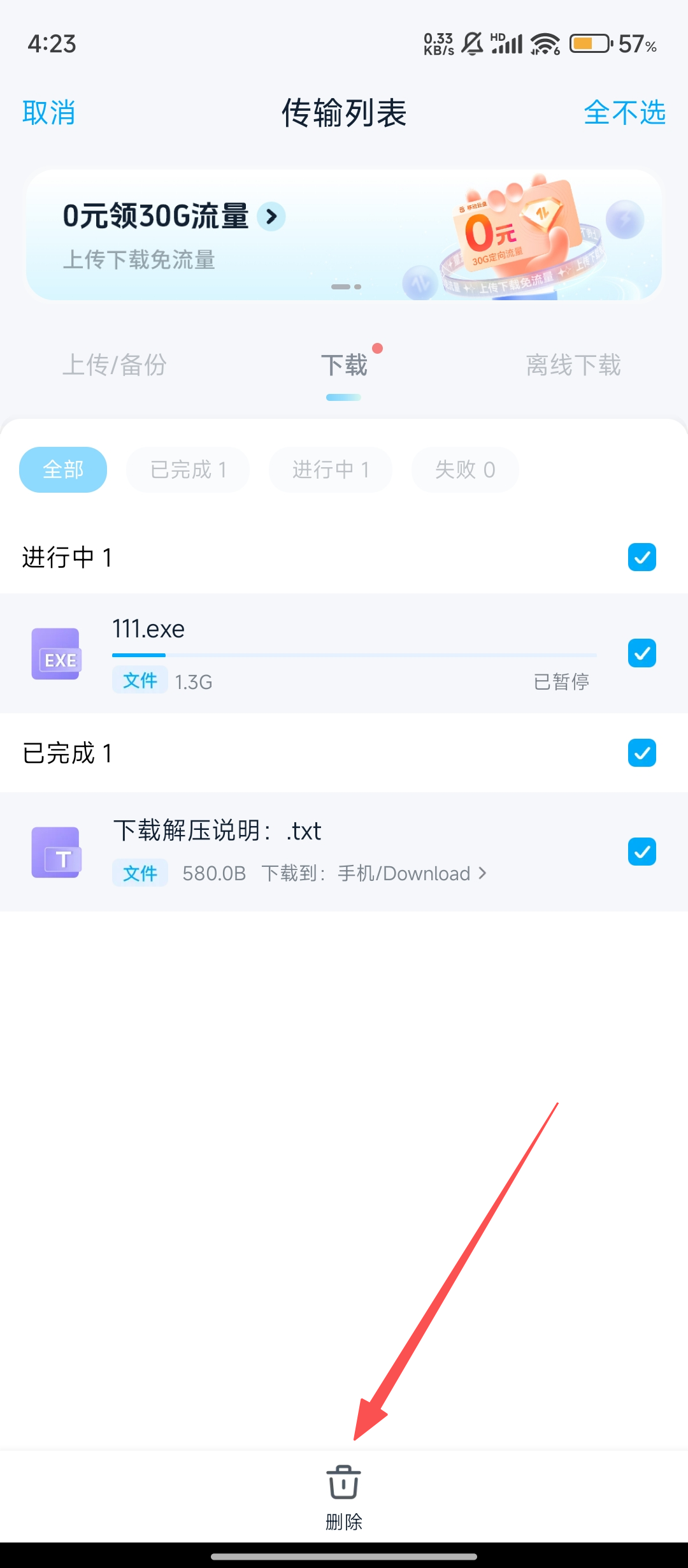 2、在传输列表的【下载】标签下,长按要删除的文件,为后续操作做准备呢。