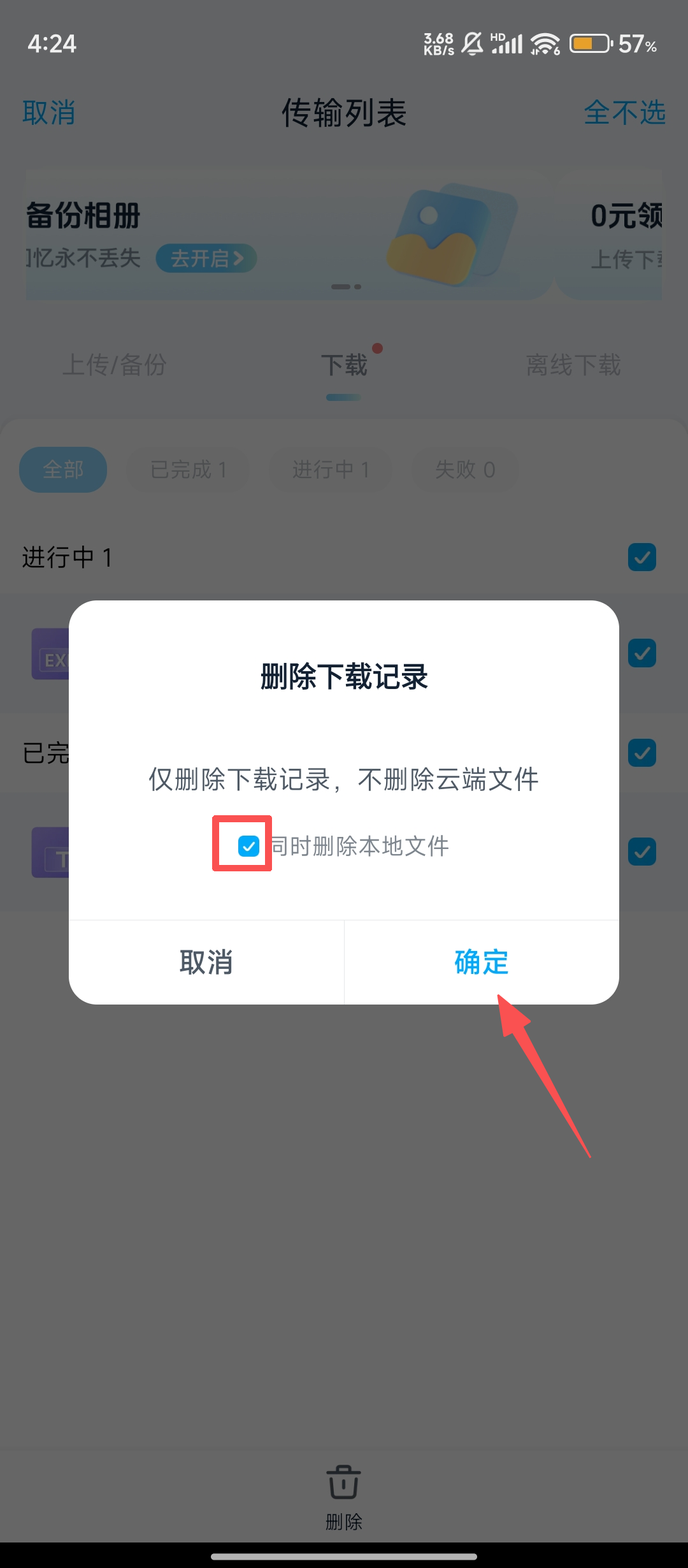 4、在【删除下载记录】弹窗中,勾选【同时删除本地文件】,点击【确定】,即可彻底删除下载文件呀。