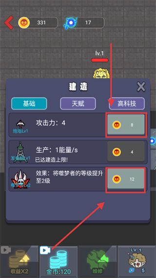 1、在建造界面,用【8】【4】【12】金币升级炮台、发电机、噬梦者,提升攻防与等级,强化战力。