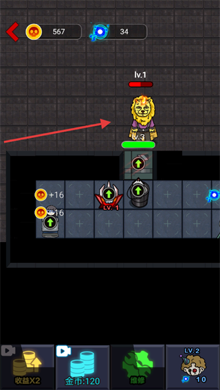 2、面对【lv.1】金色狮子怪,优先升级防御建筑,借助【+16】金币收益,补充资源应对后续猛鬼。