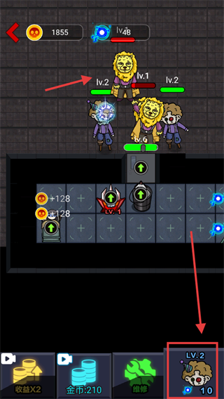 3、遭遇多只【lv.2】【lv.1】狮子怪,集中火力击高等级猛鬼,借【128】金币升级建筑,巩固防线。