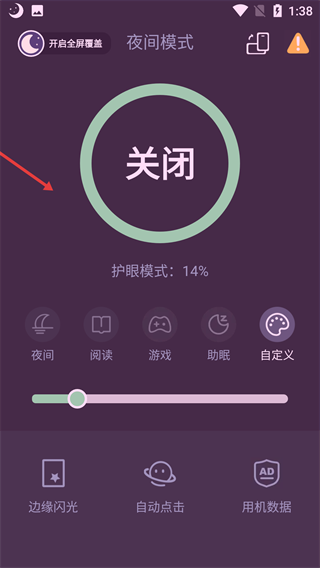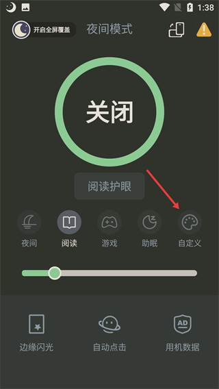 1、打开app,点击“自定义”选项,触发“自定义护眼色”设置弹窗。