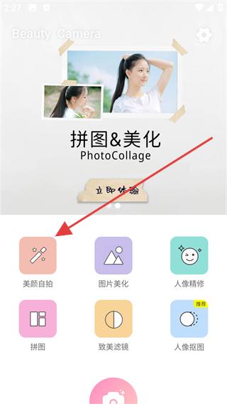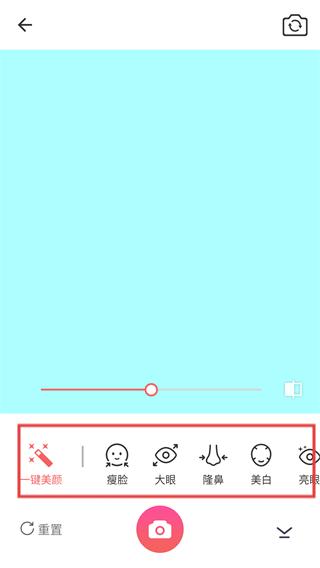 2、在拍摄界面点击底部【美颜】按钮,展开美颜功能栏,包含【一键美颜】【瘦脸】等选项。