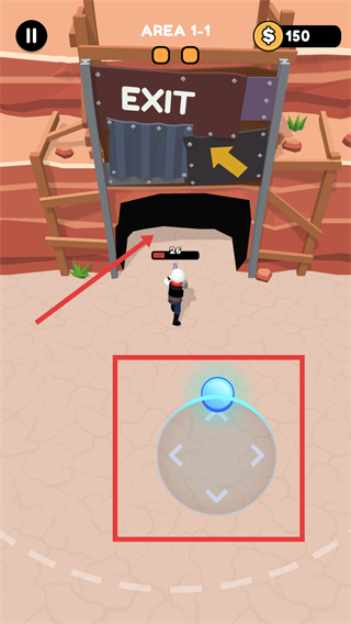 4、利用下方红色框内的虚拟摇杆操控角色移动,向【EXIT】方向前进,完成关卡。