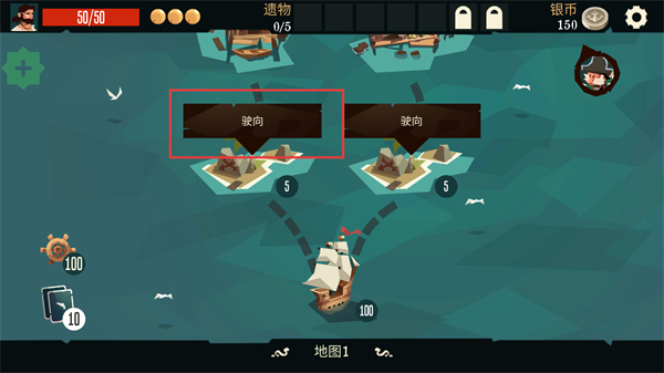 1、在地图界面选择“驶向”的岛屿,探索岛屿获取资源和遗物,提升海盗船的战力和资源储备。
