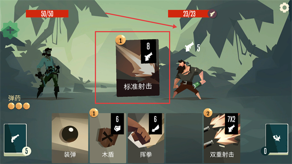 2、战斗中使用“标准射击”卡牌攻击敌人,消耗敌人弹药,积累伤害优势。