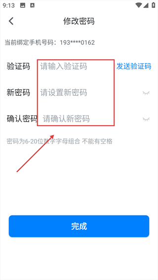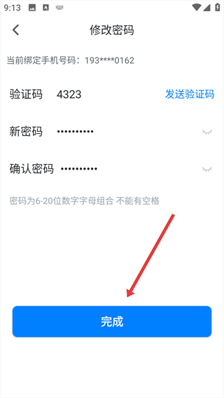 4、填好后,点击“完成”按钮,完成密码修改流程。