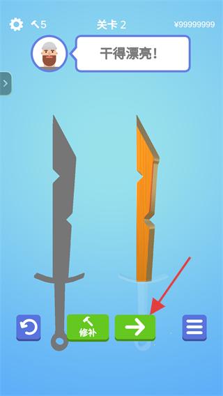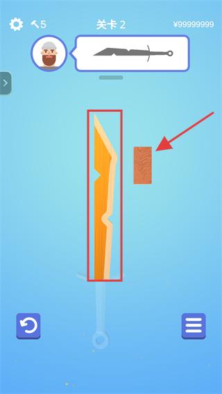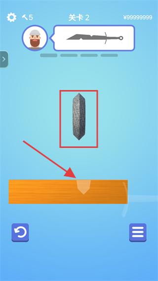 2、关卡2中,【长按屏幕】使用红色框内的砂轮在红色箭头指向的木头上打磨剑刃。