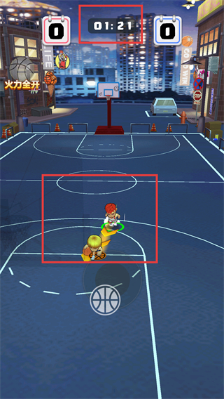 1、比赛初始(比分0-0,剩余1:21),通过滑动操作控制角色靠近对方持球球员(红色框区域),尝试抢断球权,为己方进攻创造机会。