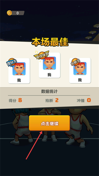 4、结算界面显示“本场最佳”(得分8、抢断2),点击【点击继续】进入下一轮比赛。