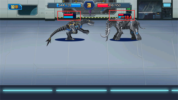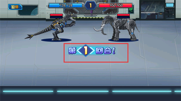 1、进入第1回合对战,己方机甲(恐龙型)与敌方机甲(大象型)初始血量分别为728/728、950/950,需通过回合攻击逐步削减敌方血量。