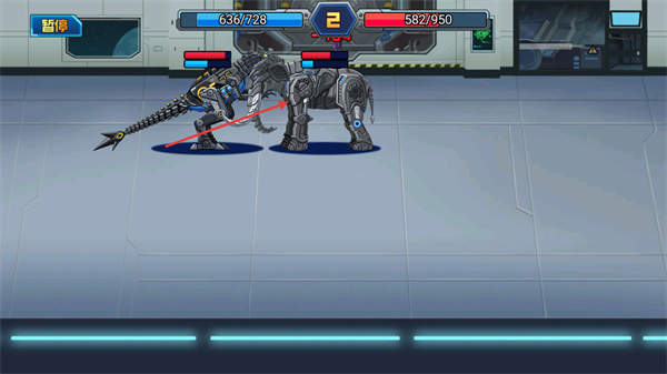 2、第2回合中己方机甲发动攻击,敌方血量降至582/950,同时己方血量减少至636/728,需保持攻击节奏压制敌方。
