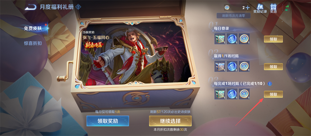 3、进入月度福利礼册界面,完成对应任务后点击领取按钮,像【张飞-五福同心】这样的皮肤奖励说不定就到手了呢。