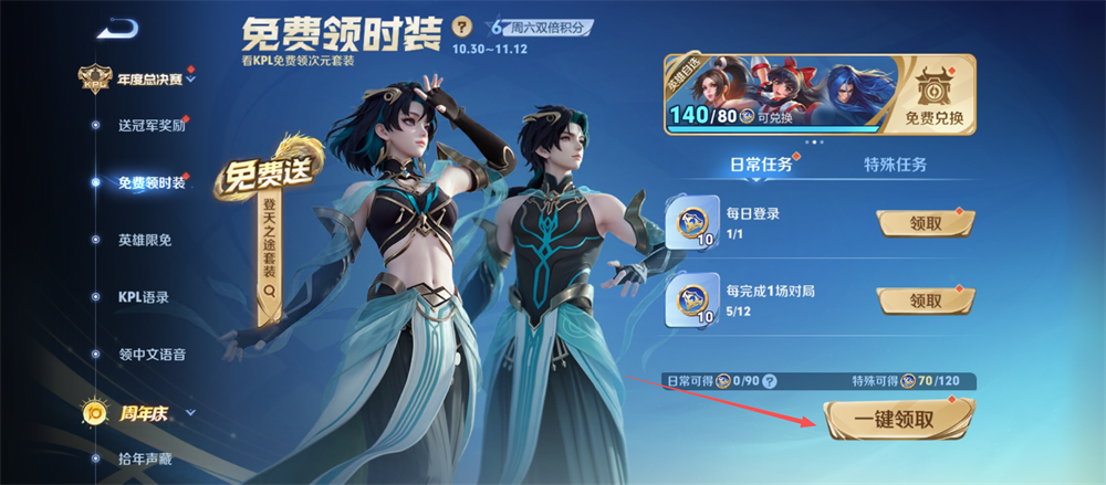4、参与免费领时装活动时,完成日常任务后点击【一键领取】,能快速收获奖励,还能积攒积分兑换英雄自选礼包哦。