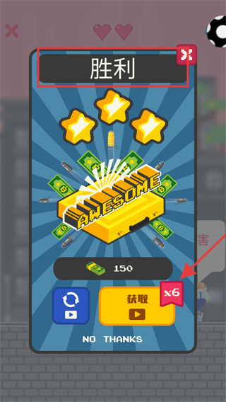 4、通关胜利后获取金币与星星奖励,点击【获取】按钮领取资源用于升级武器。
