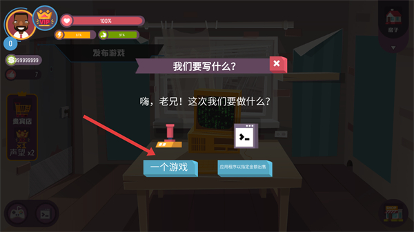 2、在对话选择界面,点击“一个游戏”选项,确定本次发布的内容类型,推进任务。
