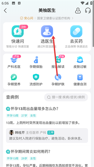 2、在美柚医生页面,点击【选医生】,进入医生选择界面,可根据科室挑选合适医生哦。