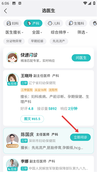 3、在选医生页面,找到目标医生,点击【立即问诊】,进入医生详情页啦。