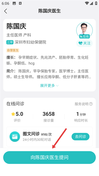 4、在医生详情页,点击【向陈国庆医生提问】,即可发起图文问诊,咨询孕期健康问题呢。