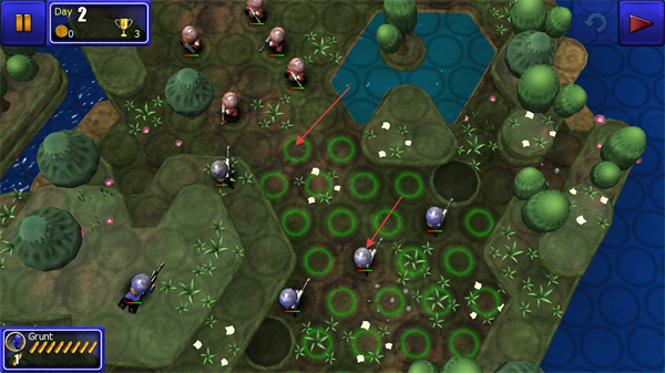 3、在游戏场景中,将士兵移动到红色箭头指向的绿色圆圈区域,部署兵力。