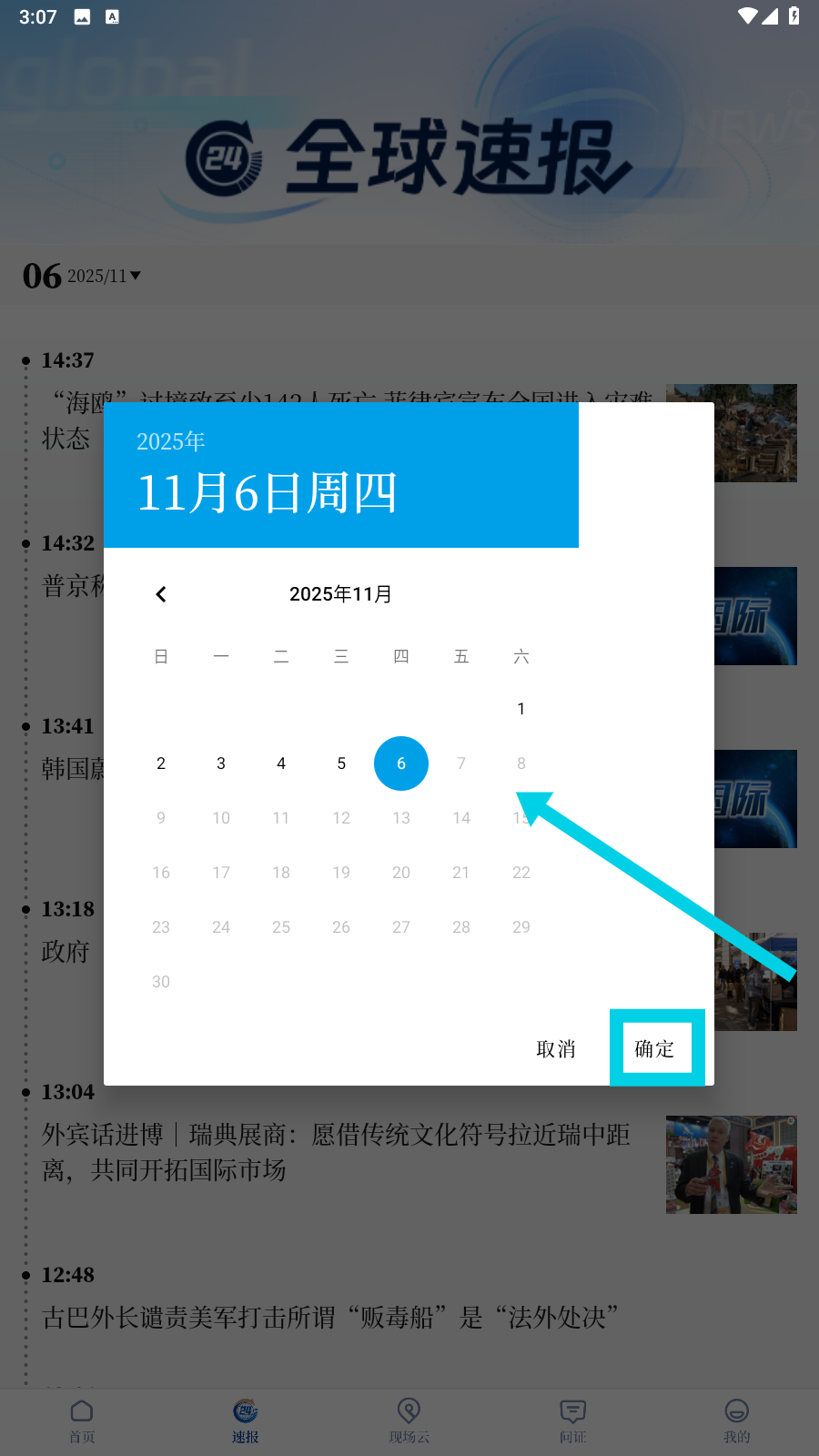 3、在日历中选择目标日期,比如【2025年11月1日】,点击【确定】,即可筛选该日期的速报新闻啦。