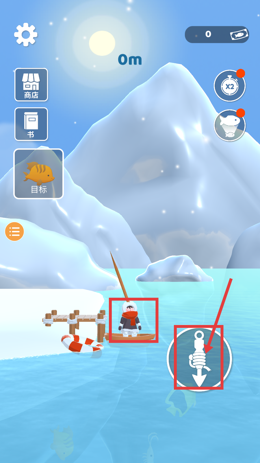 1、进入游戏后,点击右侧锚形按钮,操控小船开始钓鱼,可查看左侧【商店】【书】【目标】功能,熟悉界面后开启钓鱼之旅。