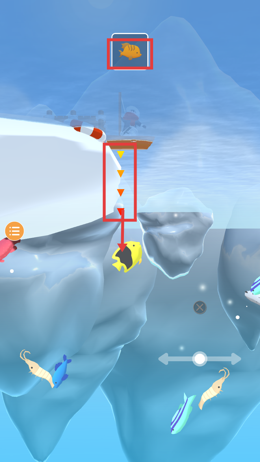 2、钓鱼时,关注上方目标鱼,沿着箭头方向操作,精准瞄准鱼群,逐步完成钓鱼目标。