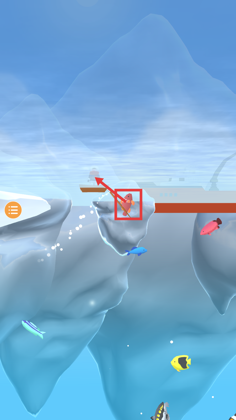 3、钓到鱼后,将鱼沿箭头方向拉回小船,完成捕捞动作,积累钓鱼经验,解锁更多鱼类。