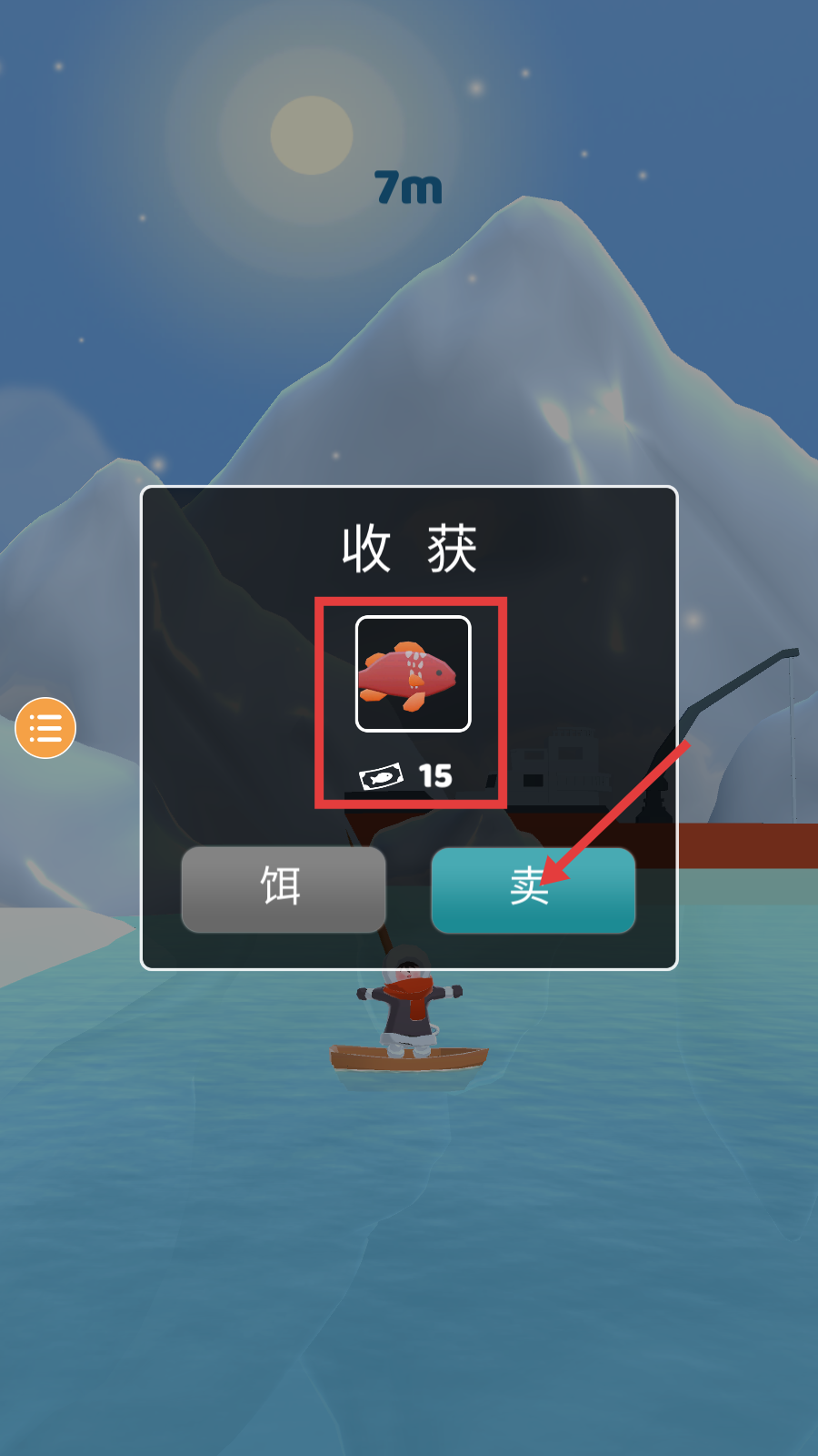 4、收获鱼类后,点击【卖】按钮,可获得金币,如【红色鱼-15】金币,积累资源用于升级渔具或解锁新区域。