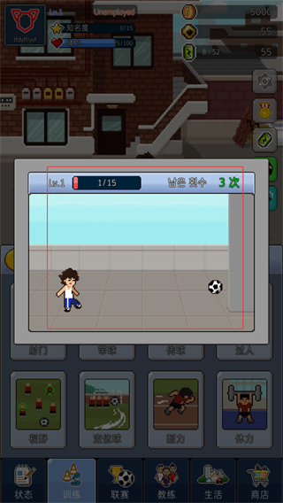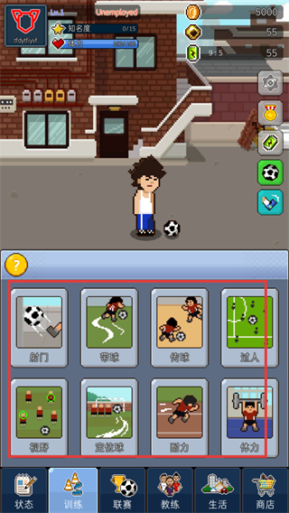 2、主界面下方有多种训练选项(如射门、带球、传球等),可通过这些训练提升球员能力,初期建议优先选择基础训练。