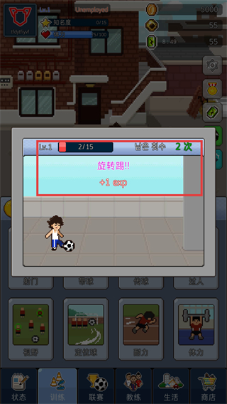 4、成功完成“旋转!!”操作后,训练进度更新为2/15,同时获得+1经验值,继续完成剩余训练任务可提升球员的技术属性。