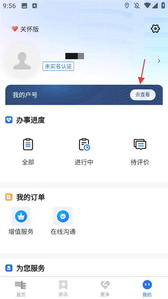1、在个人中心页面,点击【我的户号】旁的【去查看】。