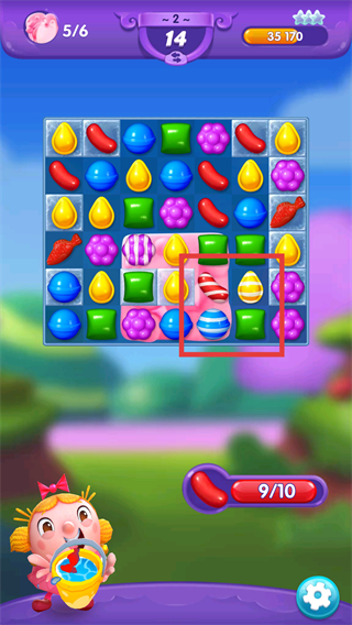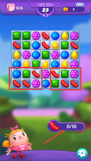 2、在糖果网格中,消除红色框内的糖果,完成【0/10】红色糖果的消除目标。