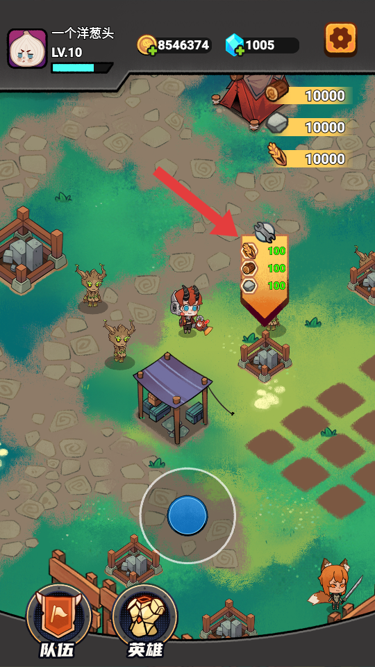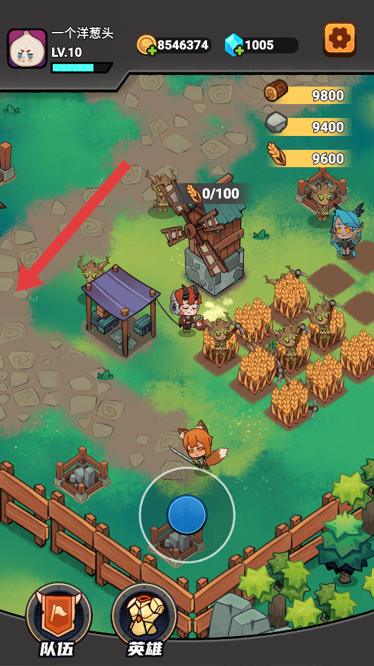 2、将麦田修复完成后,依据红箭头指示方向移动角色,探索地图并寻找可采集的资源点。