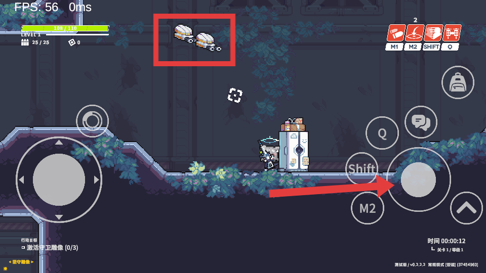 2、进入游戏后,利用右侧虚拟按键操控角色移动,遇到方框内敌人后,点击红标位置进行攻击。