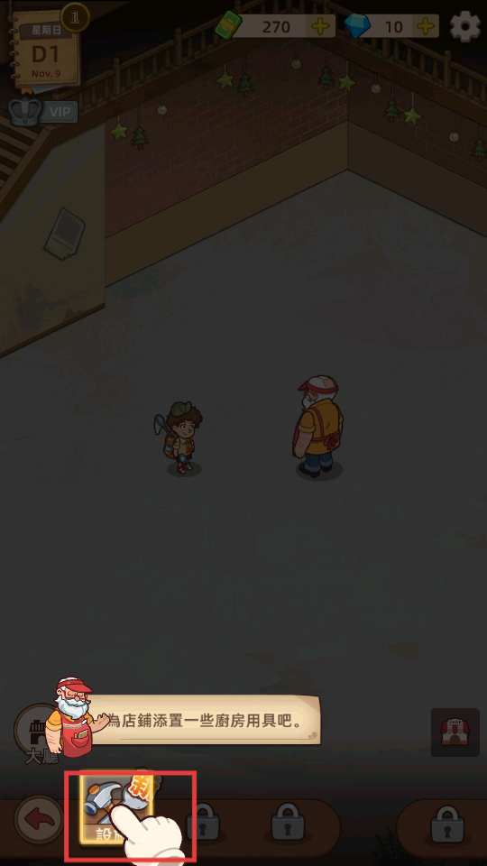 1、点击【设置】,为店铺添置厨房用具,开启店铺的运营准备。