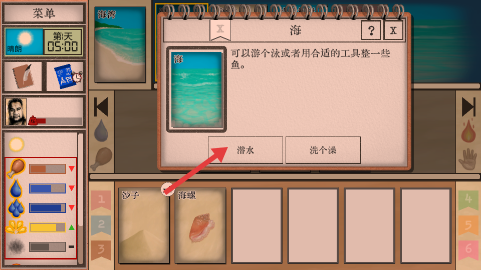 3、选择【潜水】,在海里获取鱼等资源,补充生存所需的食物和资源。