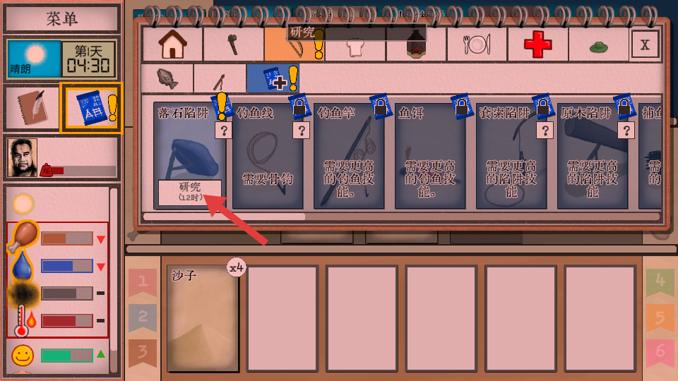 2、研究落石陷阱,提升生存技能,为后续获取资源或防御奠定基础。