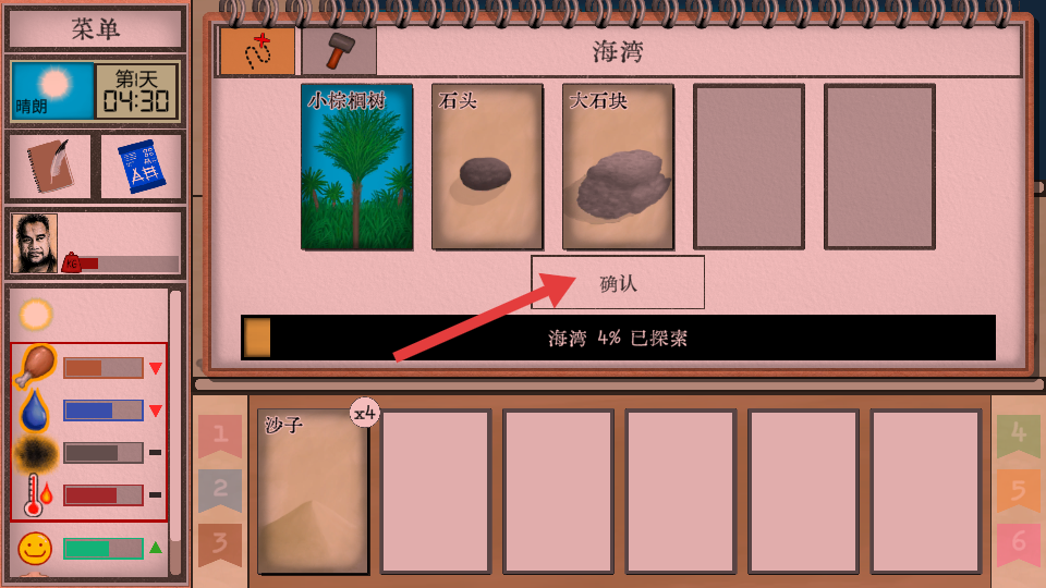 1、点击【确认】,探索海湾,收集资源,推进海湾探索进度。