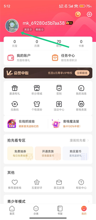 1、进入漫客栈,在【我的】页面点击头像,进入个人信息页面呢。